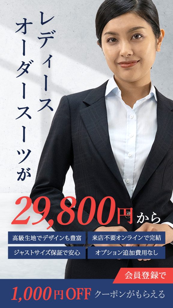 | 制作コメント | レディースオーダースーツの広告配信用バナーを制作しました。 Google広告・Instagram広告・Facebook広告に対応するため、縦型(1080×1920)、正方形(1080×1080)、横型(1200×628)の3サイズで展開。価格訴求「29,800円から」をメインに据えつつ、ネイビーを基調としたデザインで信頼感と高級感を演出しました。縦型ではインパクト重視、正方形では情報整理、横型では視認性とバランスを意識するなど、媒体特性に合わせてレイアウトを最適化しています。トリミングや表示比率の違いを想定し、どのサイズでも主訴求が崩れない構成設計を行いました。 |