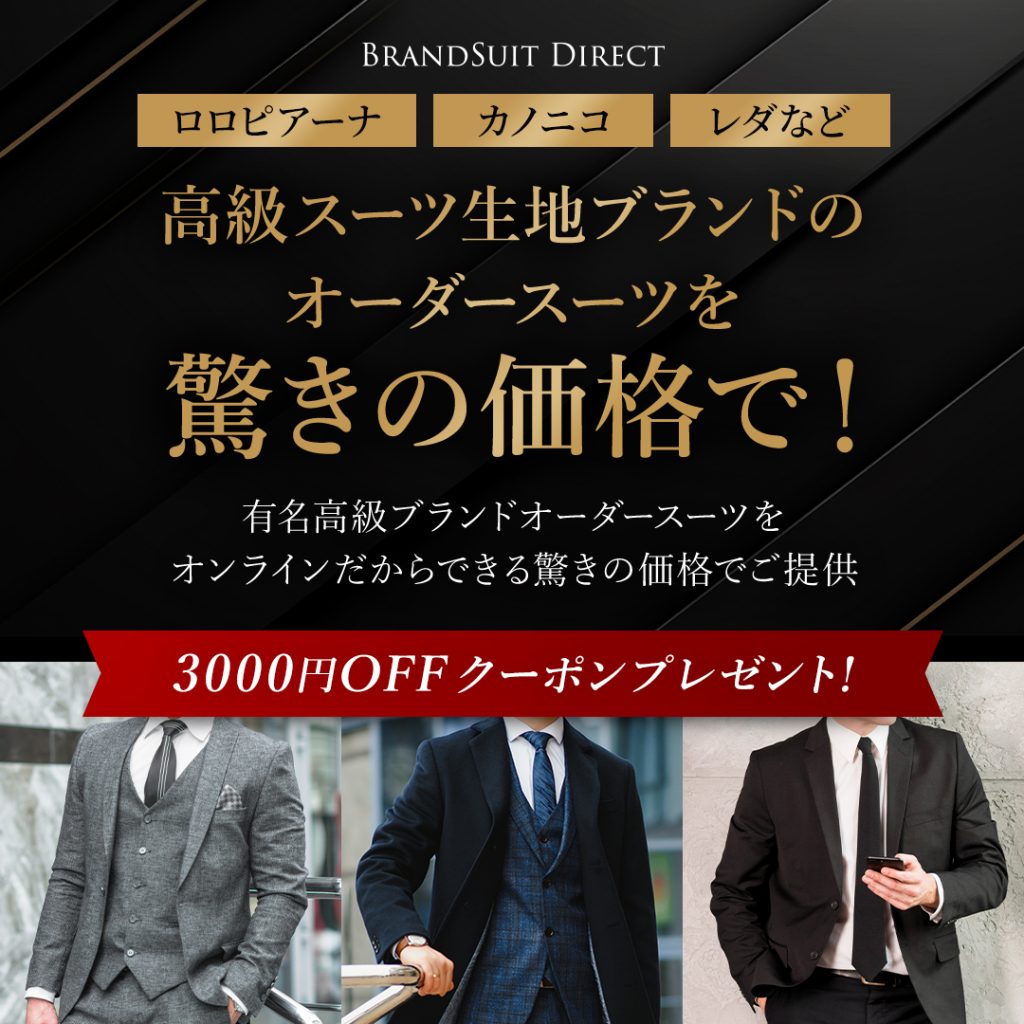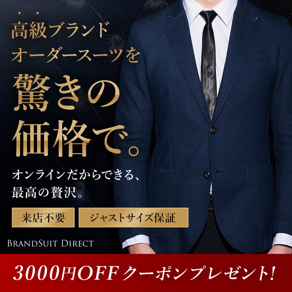 | 制作コメント | 高級ブランド生地を訴求軸にしたメンズオーダースーツの広告用バナーを制作しました。 Google広告・Instagram広告・Facebook広告配信を想定し、テイストの異なる3種類のクリエイティブを展開。ブラック×ゴールドで高級感を強調した訴求型、信頼性と実績を前面に出した安心訴求型、価格インパクトを主軸にした価格訴求型と切り口を分け、ABテストに対応できる構成に設計しています。「驚きの価格で」というメッセージと3000円OFFクーポンを組み合わせ、視認性とクリック誘導を両立。媒体ごとの表示特性を考慮し、主訴求が埋もれないレイアウトバランスで制作しました。 |